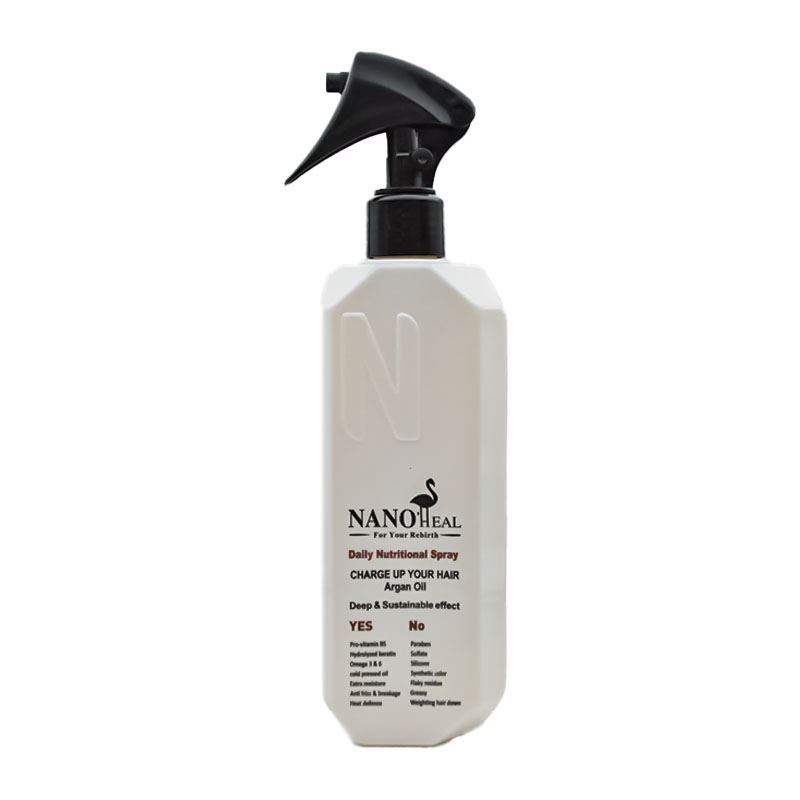 اسپری تقویت کننده مو نانوهیل حاوی روغن آرگان محصولی با جذب سریع و بدون ایجاد حس سنگینی است که باعث ترمیم ، درخشان شدن و آبرسانی و تقویت تار مو می شود . این محصول برند نانوهیل مناسب استفاده روزانه و انواع مو هاست . از جمله ترکیبات مهم این تقویت کننده مو می توان به چای سبز و روغن آرگان اشاره کرد . عصاره چای سبز موخوره را کاهش می دهد و آن ها را درخشان می کند . خاصیت ضد التهابی چای سبز از مشکلات مربوط به پوست سر و شوره جلوگیری می کند . همچنین کافئین موجود در چای سبز می تواند باعث جلوگیری از افزایش دی هیدروتستسترون ( هورمونی که مهم ترین عامل ایجاد طاسی است ) مکم می کند .